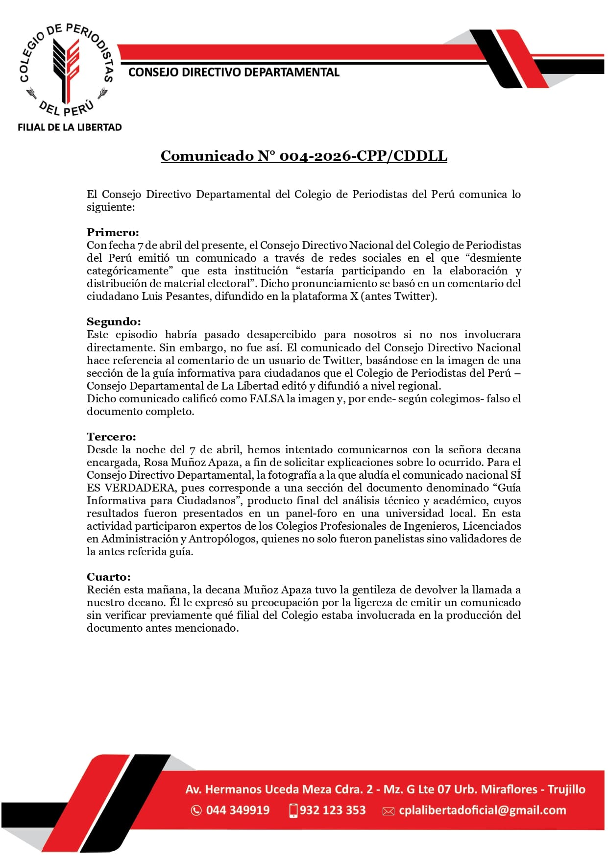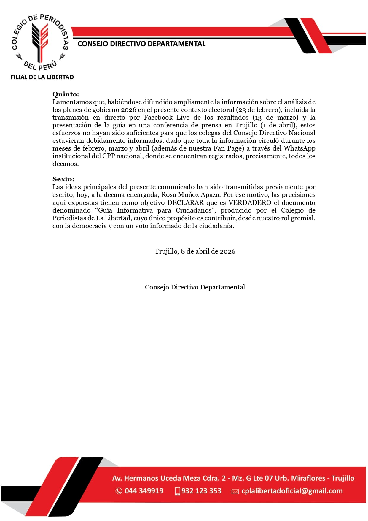 Actualidades Comunicado Colegio de Periodistas del Perú – Filial Departamental La Libertad abril 9, 2026 Compartir: PrevAnteriorComunicado Colegio de Periodistas del Perú SiguienteHomenaje a Andrés Fernández GarridoNext También puede ver: RÉQUIEM PARA UN DISTINGUIDO HOMBRE DE LA PRENSA CAJAMARQUINA, DON MANUEL SILVA ARANDA Pronunciamiento Homenaje a Andrés Fernández Garrido Comentarios: Recientes Comunicado Colegio de Periodistas del Perú El Show de la Mentira: Cuando la Política Cambió la Plaza por el Coliseo CAJAMARCA DECLARA DE INTERÉS PÚBLICO REGIONAL LA PREVENCIÓN INTEGRAL DE RIESGOS SOCIALES EN ADOLESCENTES Y JÓVENES DIARIO HISTÓRICO DEL DEPARTAMENTO DE CAJAMARCA DIARIO HISTÓRICO DEL DEPARTAMENTO DE CAJAMARCA DIARIO HISTÓRICO DEL DEPARTAMENTO DE CAJAMARCA