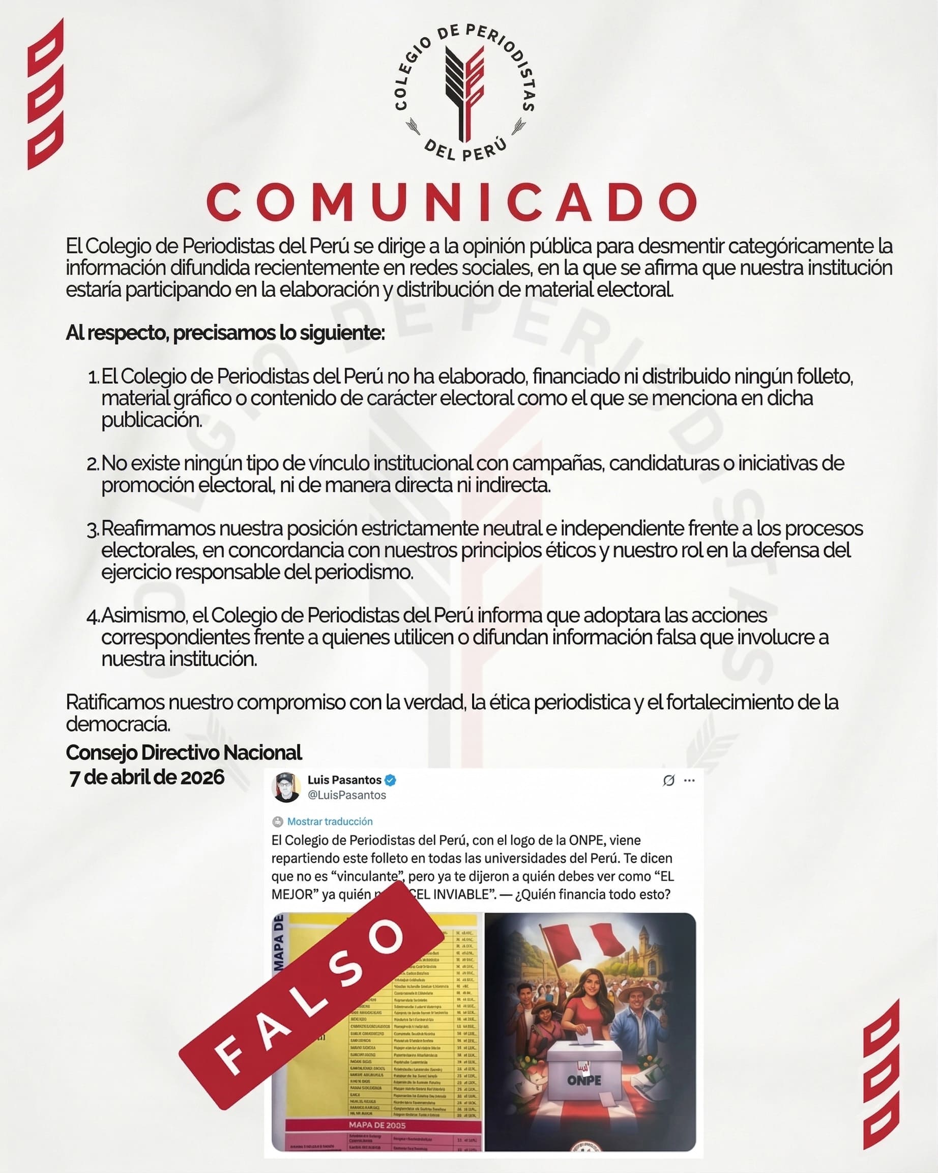 Actualidades Comunicado Colegio de Periodistas del Perú abril 8, 2026 El Colegio de Periodistas del Perú desmiente su participación en elaboración y distribución de material electoral. Mantenemos una posición neutral. Compartir: PrevAnteriorEl Show de la Mentira: Cuando la Política Cambió la Plaza por el Coliseo SiguienteComunicado Colegio de Periodistas del Perú – Filial Departamental La LibertadNext También puede ver: RÉQUIEM PARA UN DISTINGUIDO HOMBRE DE LA PRENSA CAJAMARQUINA, DON MANUEL SILVA ARANDA Pronunciamiento Homenaje a Andrés Fernández Garrido Comentarios: Recientes Comunicado Colegio de Periodistas del Perú – Filial Departamental La Libertad El Show de la Mentira: Cuando la Política Cambió la Plaza por el Coliseo CAJAMARCA DECLARA DE INTERÉS PÚBLICO REGIONAL LA PREVENCIÓN INTEGRAL DE RIESGOS SOCIALES EN ADOLESCENTES Y JÓVENES DIARIO HISTÓRICO DEL DEPARTAMENTO DE CAJAMARCA DIARIO HISTÓRICO DEL DEPARTAMENTO DE CAJAMARCA DIARIO HISTÓRICO DEL DEPARTAMENTO DE CAJAMARCA