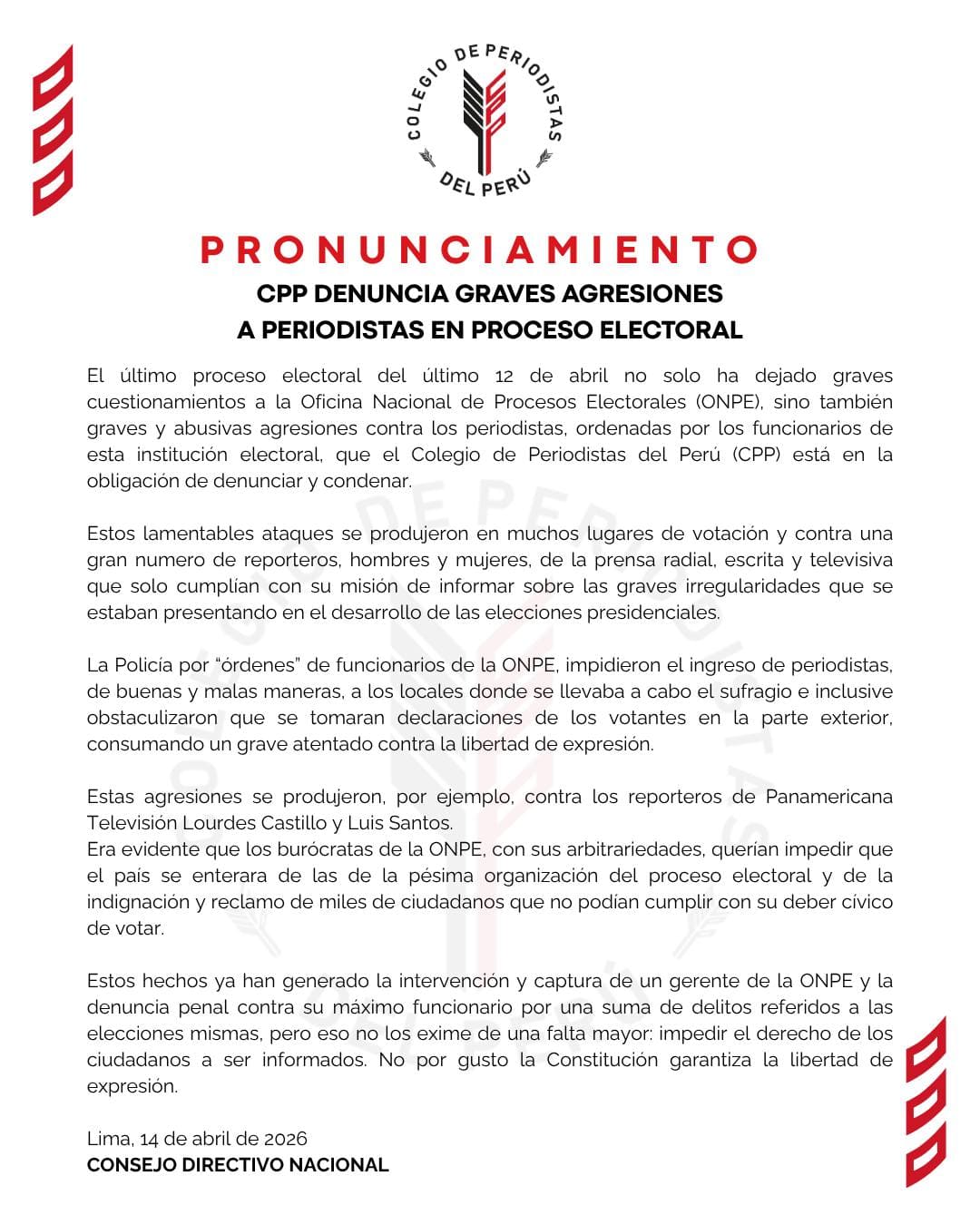Actualidades Pronunciamiento abril 14, 2026 Agredir y bloquear a periodistas durante el proceso electoral es un atentado contra la libertad de expresión. Informar no es un delito. La democracia exige transparencia. Compartir: PrevAnteriorHomenaje a Andrés Fernández Garrido SiguienteRÉQUIEM PARA UN DISTINGUIDO HOMBRE DE LA PRENSA CAJAMARQUINA, DON MANUEL SILVA ARANDANext También puede ver: RÉQUIEM PARA UN DISTINGUIDO HOMBRE DE LA PRENSA CAJAMARQUINA, DON MANUEL SILVA ARANDA Homenaje a Andrés Fernández Garrido Comunicado Colegio de Periodistas del Perú – Filial Departamental La Libertad Comentarios: Recientes Comunicado Colegio de Periodistas del Perú El Show de la Mentira: Cuando la Política Cambió la Plaza por el Coliseo CAJAMARCA DECLARA DE INTERÉS PÚBLICO REGIONAL LA PREVENCIÓN INTEGRAL DE RIESGOS SOCIALES EN ADOLESCENTES Y JÓVENES DIARIO HISTÓRICO DEL DEPARTAMENTO DE CAJAMARCA DIARIO HISTÓRICO DEL DEPARTAMENTO DE CAJAMARCA DIARIO HISTÓRICO DEL DEPARTAMENTO DE CAJAMARCA